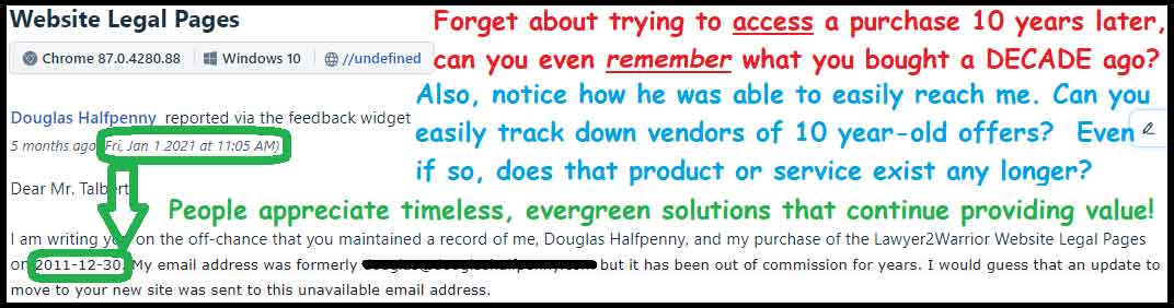 Website Legal Pages has been around for 15 years, they not only still exists, they are still fully supported! These legal pages are continually being reviewed and updated as needed to remain relevant to your online business. Check out this testimonial recently received from a former customer who purchased Website Legal Pages in 2011