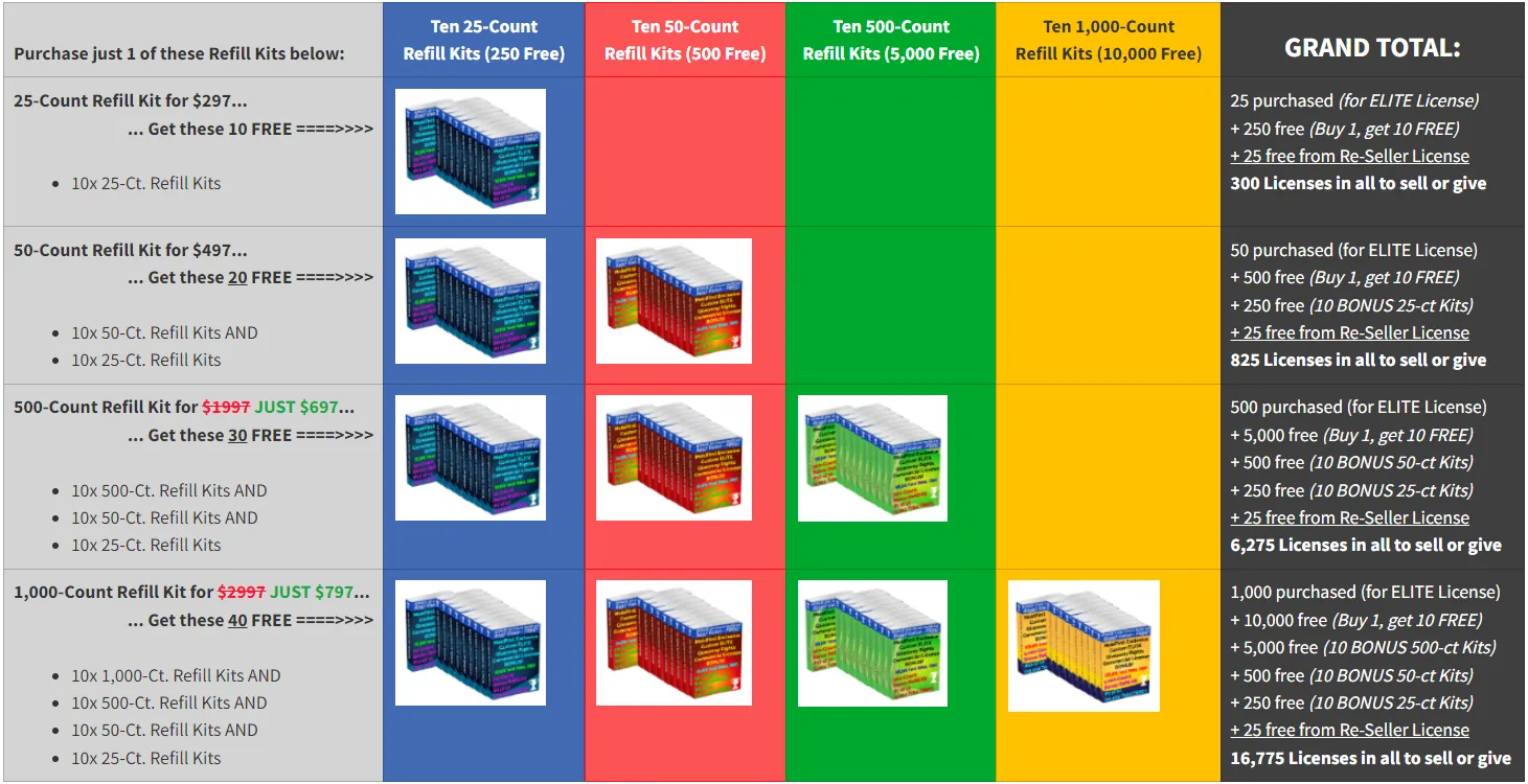 * In addition to reducing the 1,000-Count Refill Kit from $2,997 to just $797, we've also reduced our intended $297 3-pay to just $287, literally making it more affordable to access the 1,000-Count level than the 25-Count!